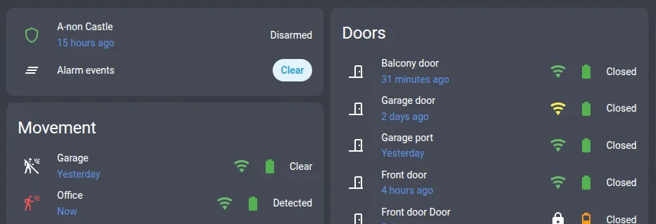 The user-friendly layer. This add-on bundles NodeSOS MQTT into a Home Assistant ready package. Just install it, configure your alarm’s IP and port, and suddenly your alarm base unit and all your connected devices (PIRs, door sensors, fire detectors etc.) show up in Home Assistant as entities you can use in automations and dashboards.